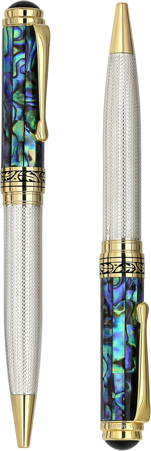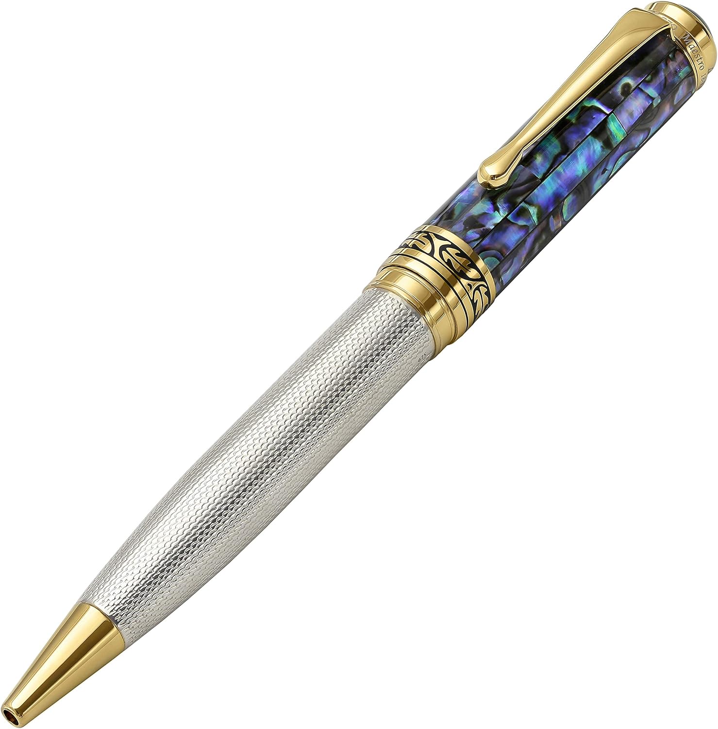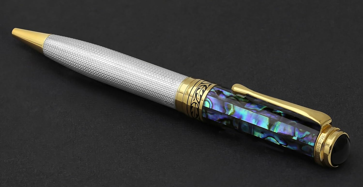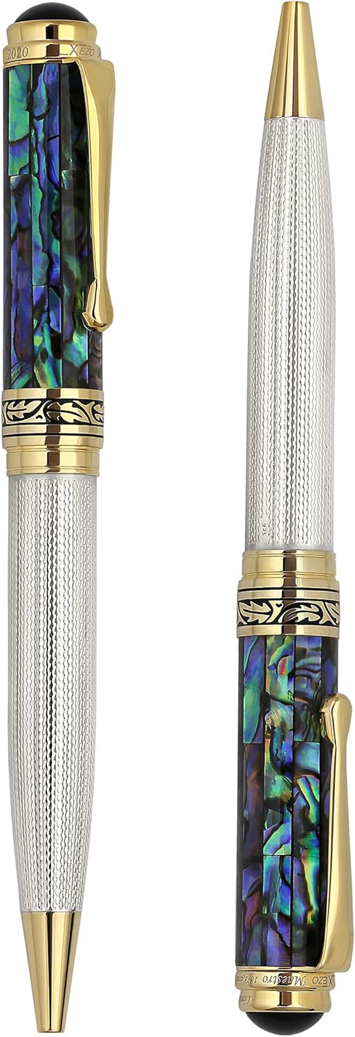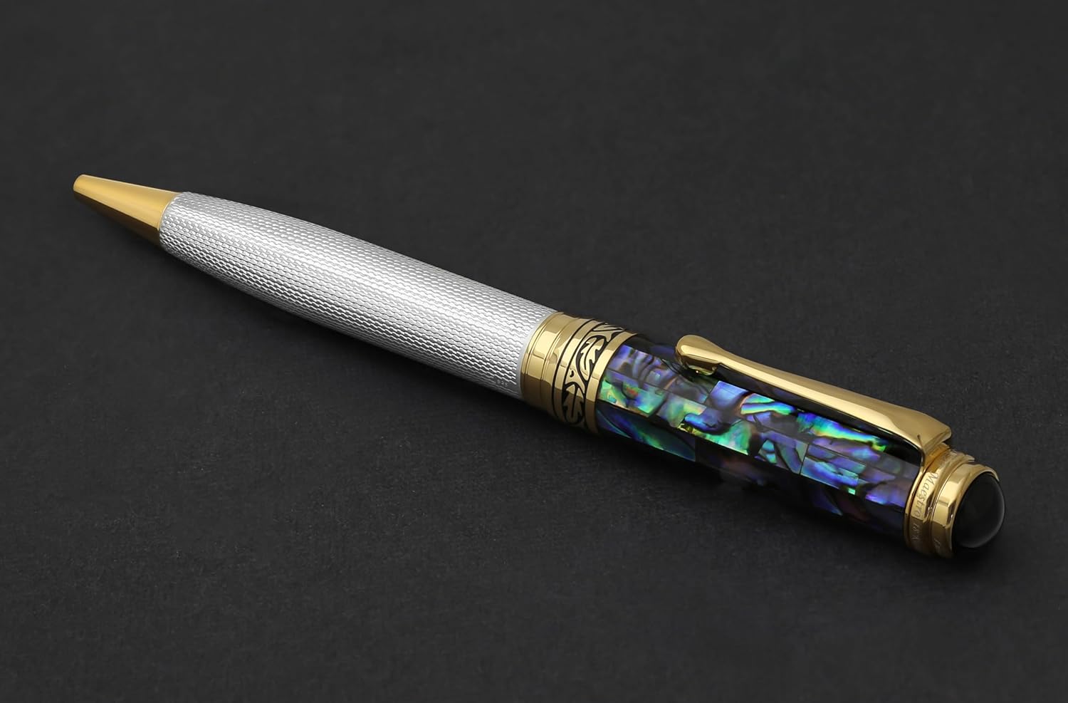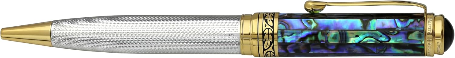 Xezo Maestro Ballpoint Pen, Solid 925 Sterling Silver and Blue Pāua Sea Shell with 18 Karat Gold Plating. Handmade, No Two Alike, Serialized