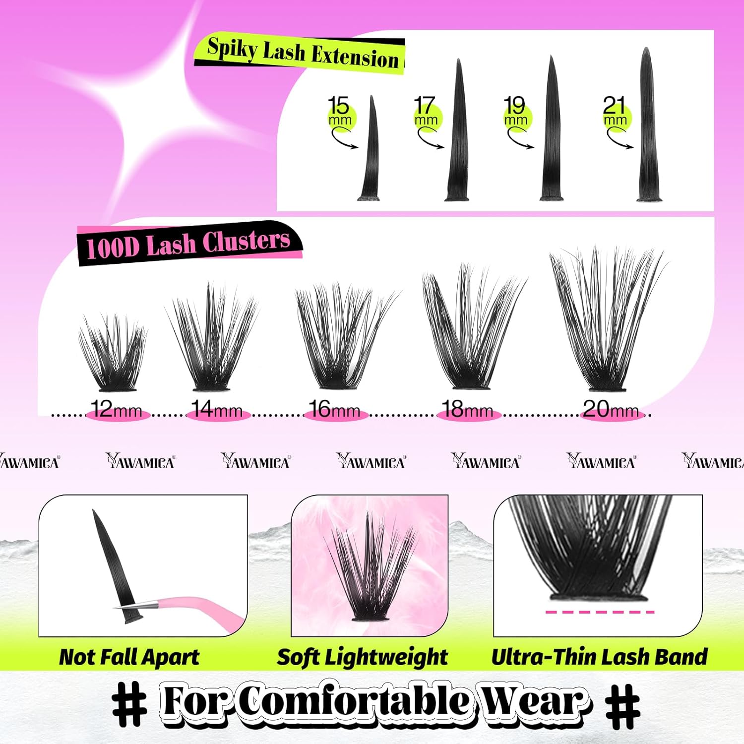 Volume Lash Clusters with Spiky Extension: Transform your look effortlessly with our premium collection of 280pcs volume cluster lashes paired with spike lashes; You can enjoy a range from 15-21mm spiky eyelashes combined with D curl eyelash clusters of 12-20mm, achieving a stunning manga-inspired lash effect while saving time and money without sacrificing quality