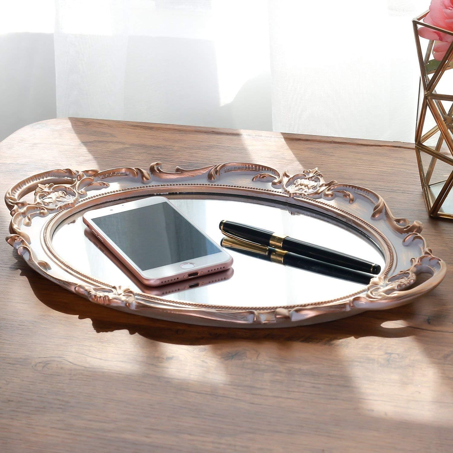 1. Unique Design: Chic oval shape featured with elegant pattern, this mirror tray will go great with both modern and vintage room style, adding a graceful touch.