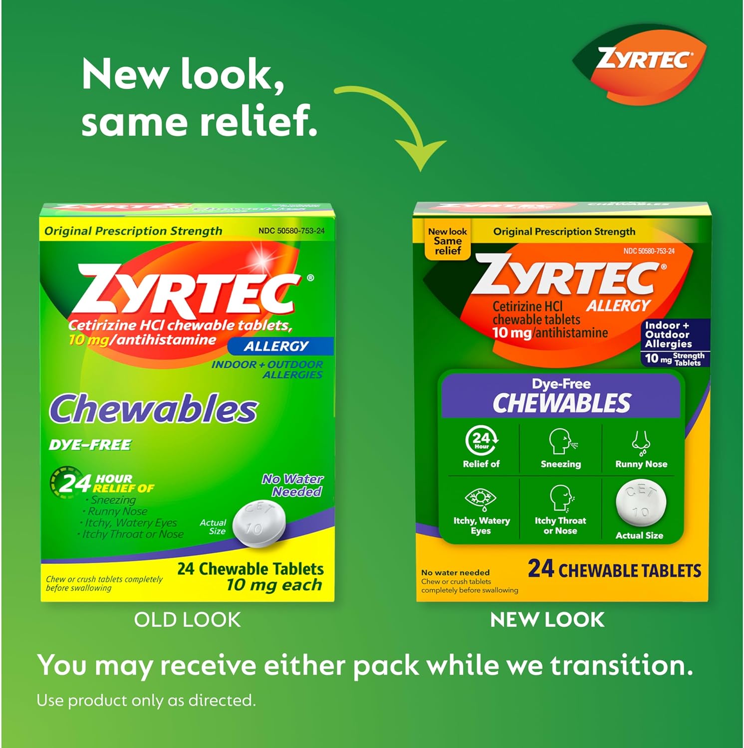 24-count pack of Zyrtec 24 Hour Allergy Relief Chewable Tablets with 10 mg cetirizine HCl for all-day relief of hay fever & both indoor & outdoor allergy symptoms, including runny nose, sneezing, itchy, watery eyes, & itchy nose & throat